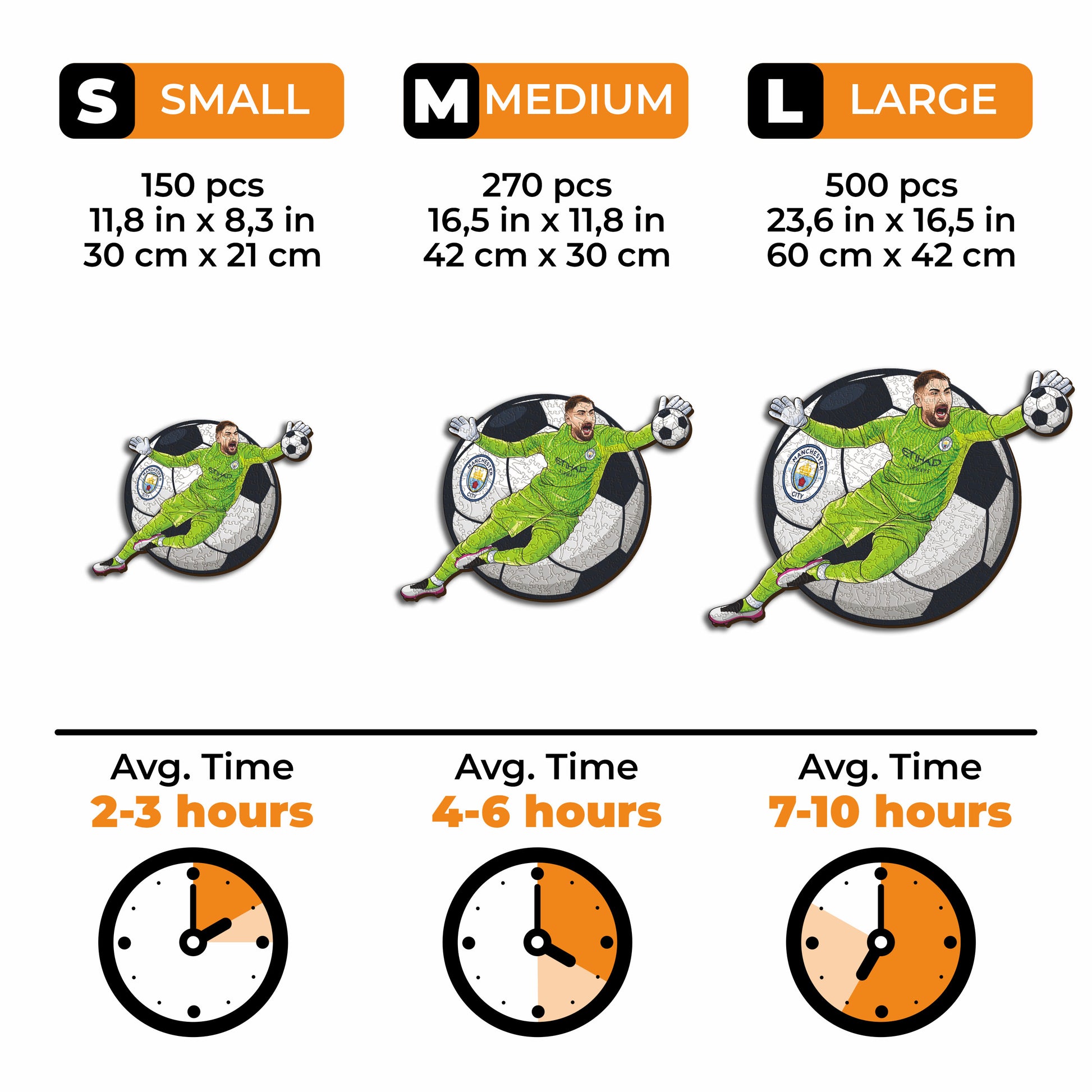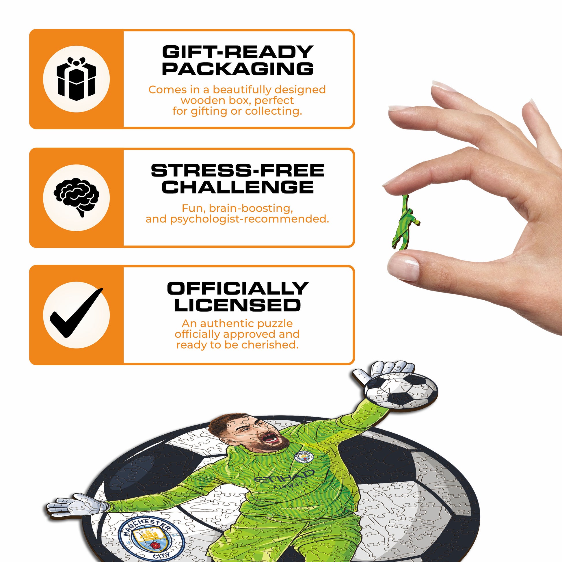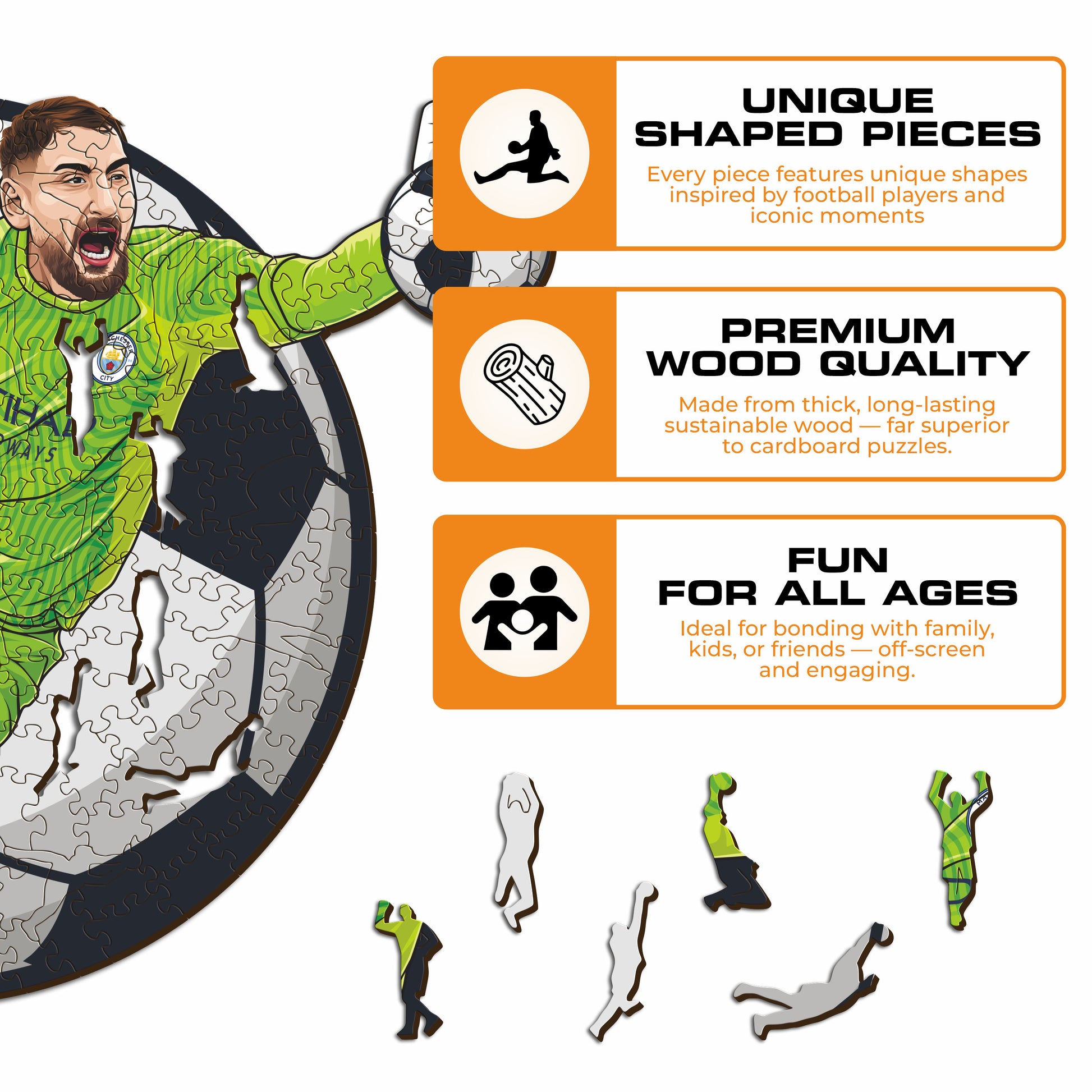 ✓ Each puzzle piece has a unique shape that depicts elements related to soccer and iconic players' poses.