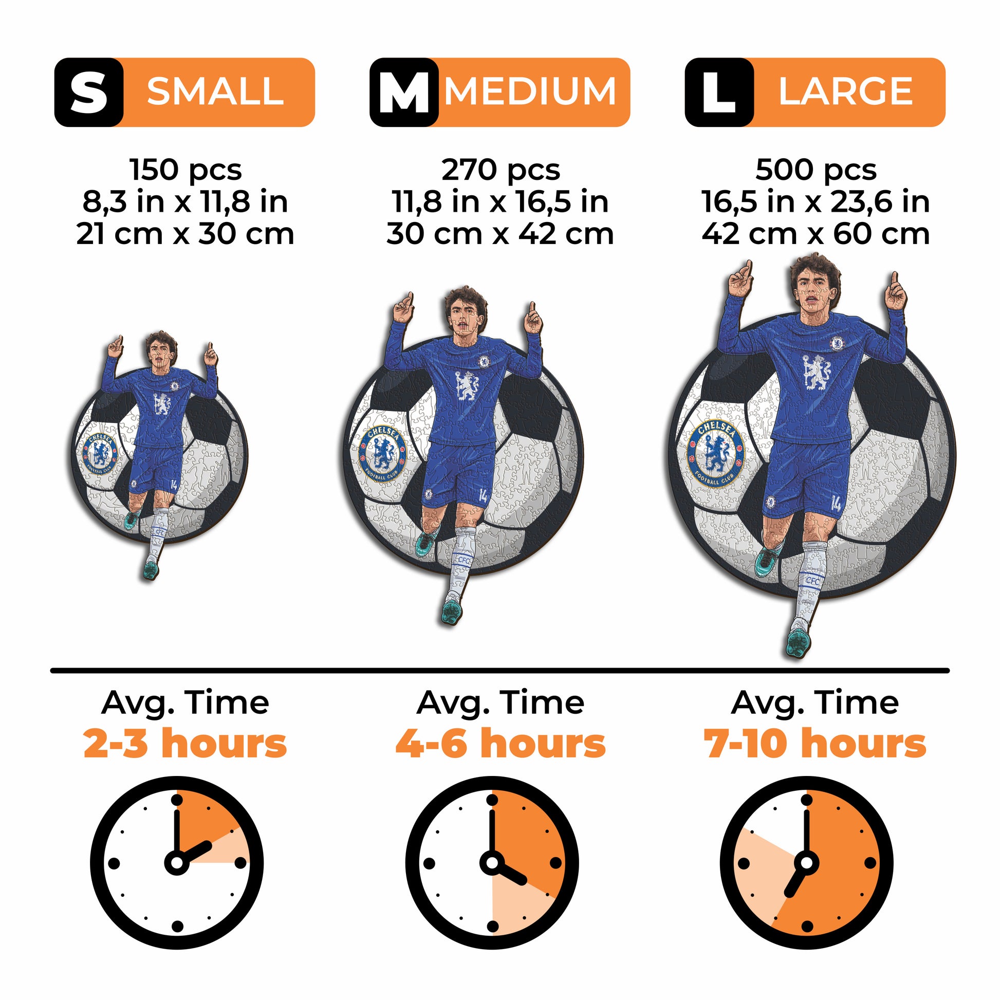 ✓ Each puzzle piece has a unique shape that depicts elements related to soccer and iconic player poses.
