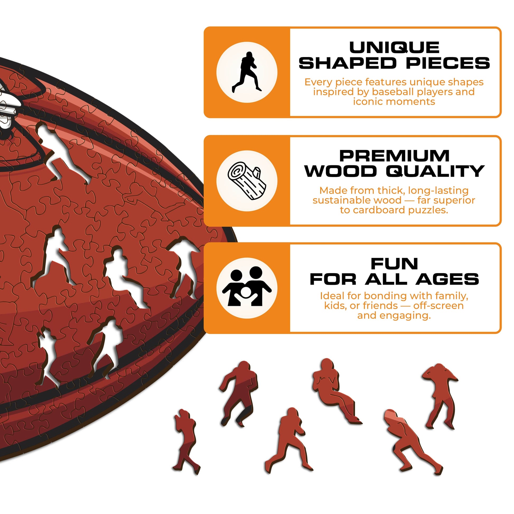 ✓ Each puzzle piece has a unique shape that depicts elements related to football and iconic player poses.