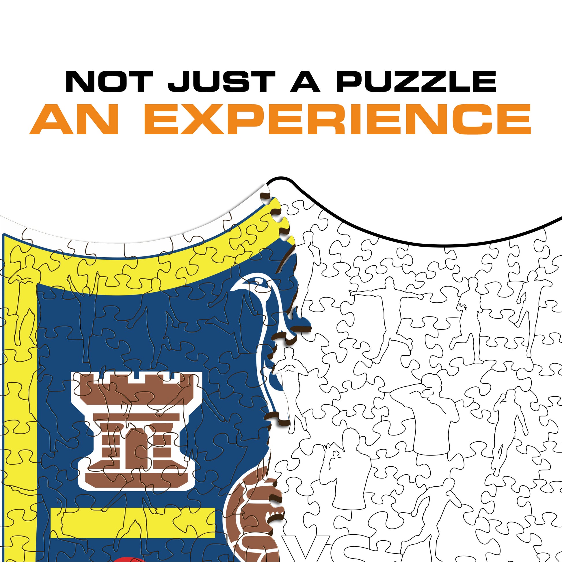 Each puzzle piece has a unique shape that depicts elements related to soccer and iconic players' poses.