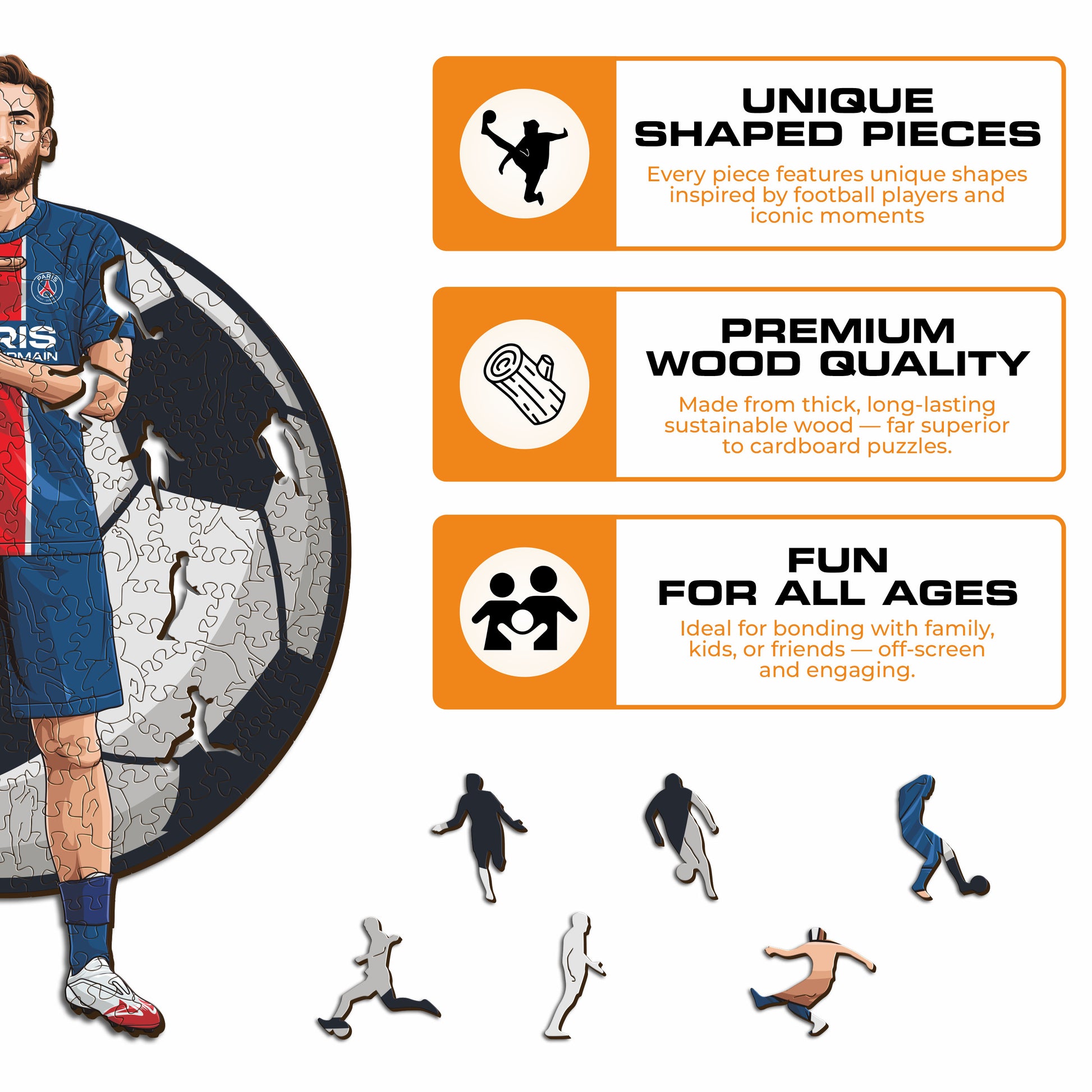 ✓各パズルのピースは、サッカーに関連する要素と象徴的な選手のポーズを描いたユニークな形状をしています。