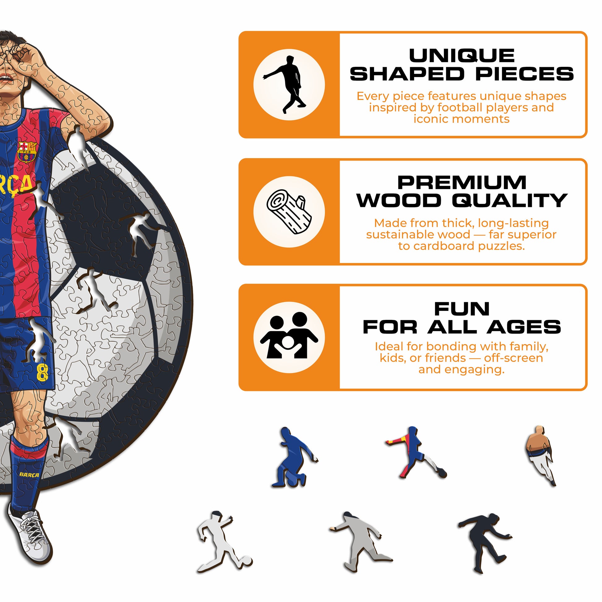 ✓各パズルピースは、サッカーに関連する要素と象徴的な選手のポーズを描いたユニークな形状をしています。