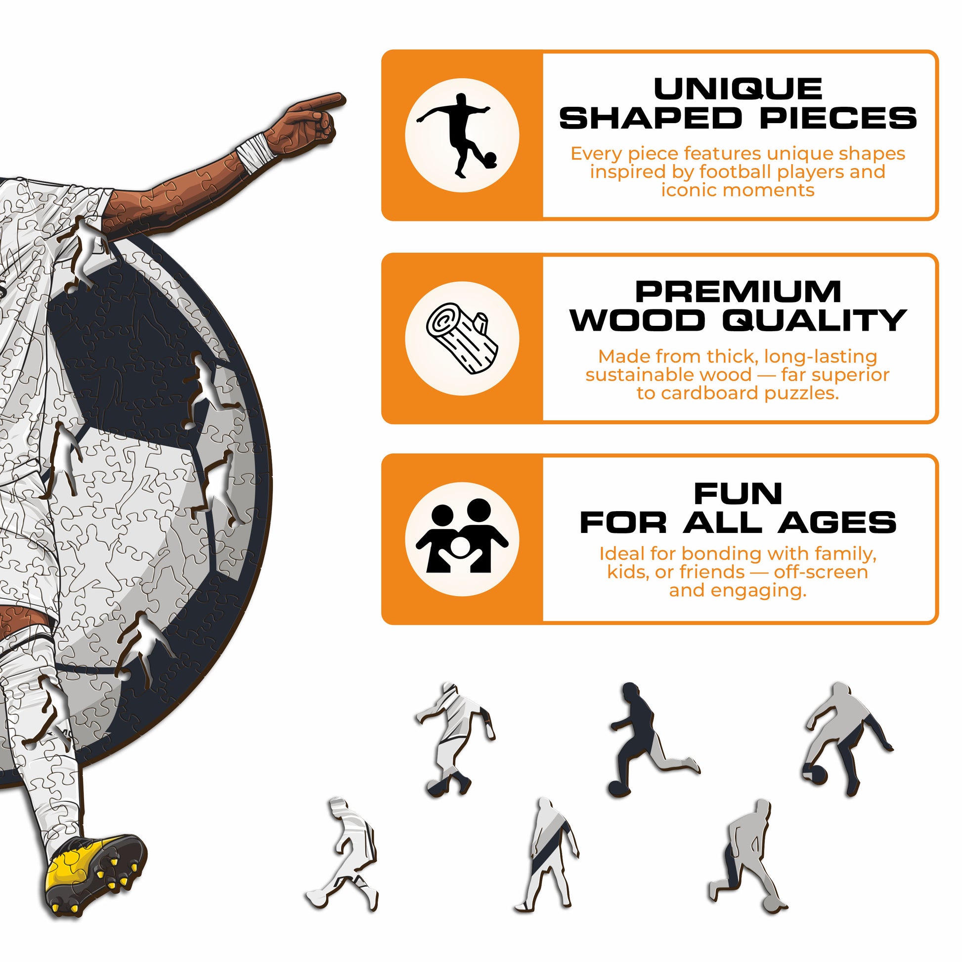 ✓各パズルのピースは、サッカーに関連する要素と象徴的な選手のポーズを描いたユニークな形状をしています。