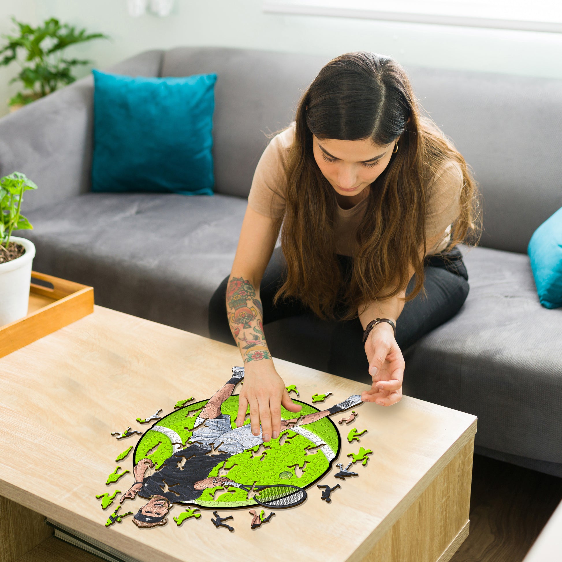 ✓ Each puzzle piece has a unique shape that depicts elements related to tennis and iconic player poses.