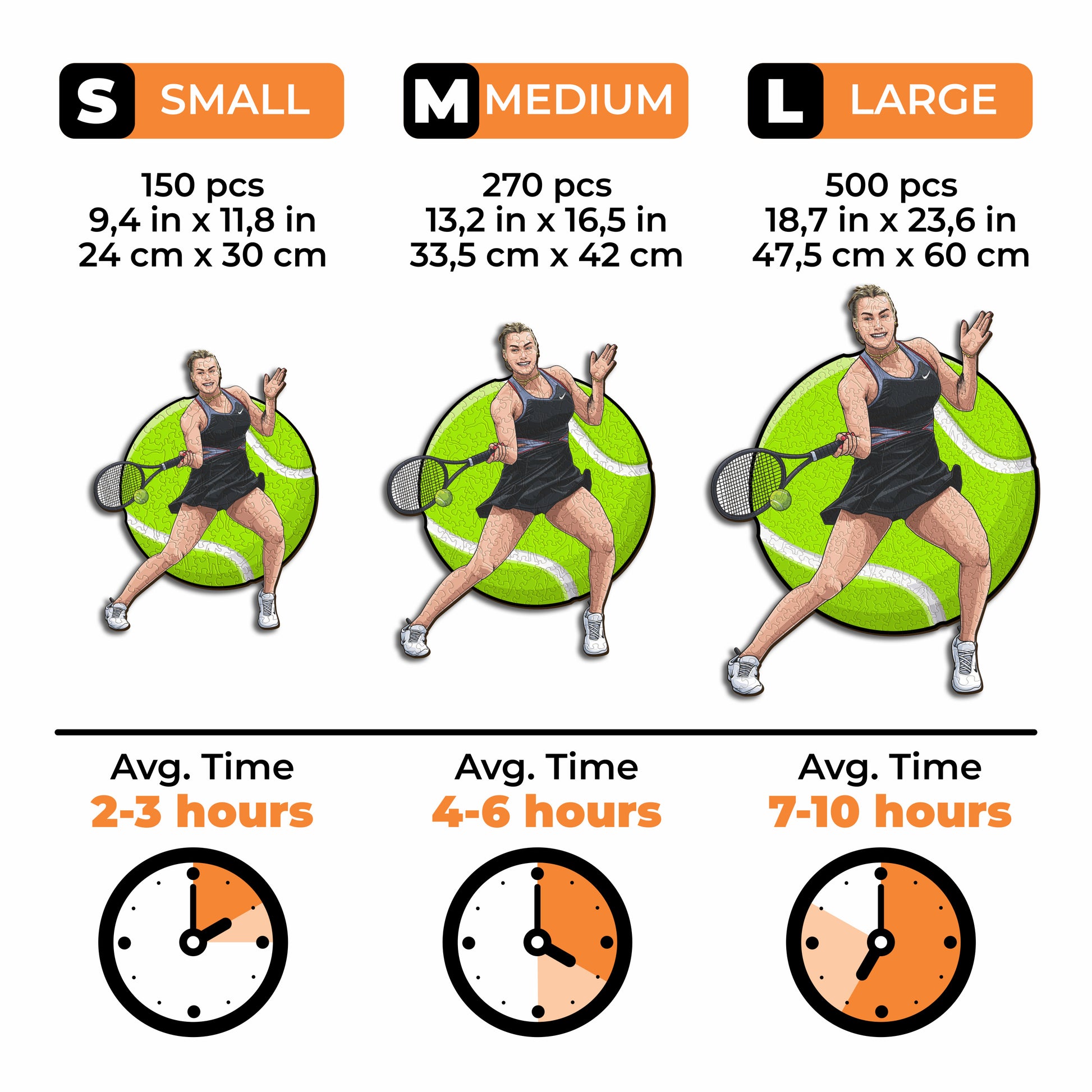 ✓ Each puzzle piece has a unique shape that depicts elements related to tennis and iconic player poses.
