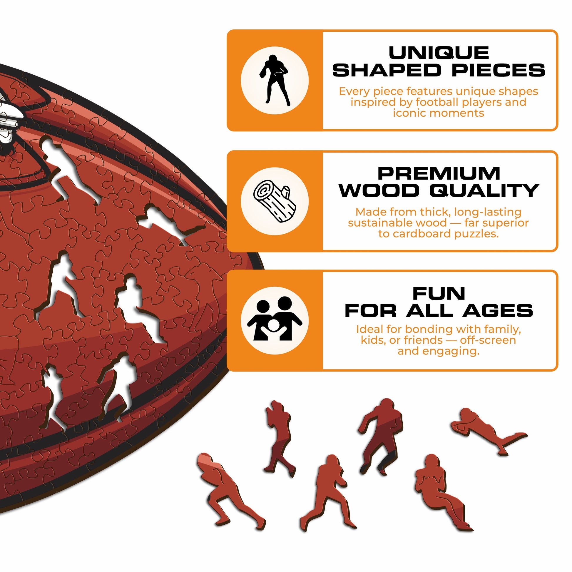✓ Each puzzle piece has a unique shape that depicts elements related to football and iconic players poses.
