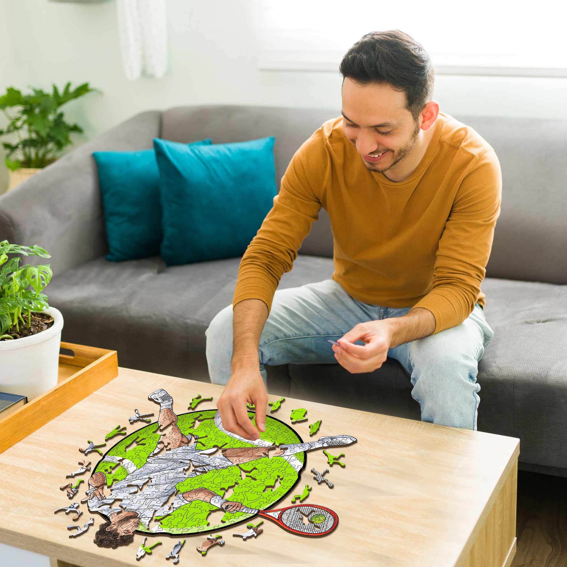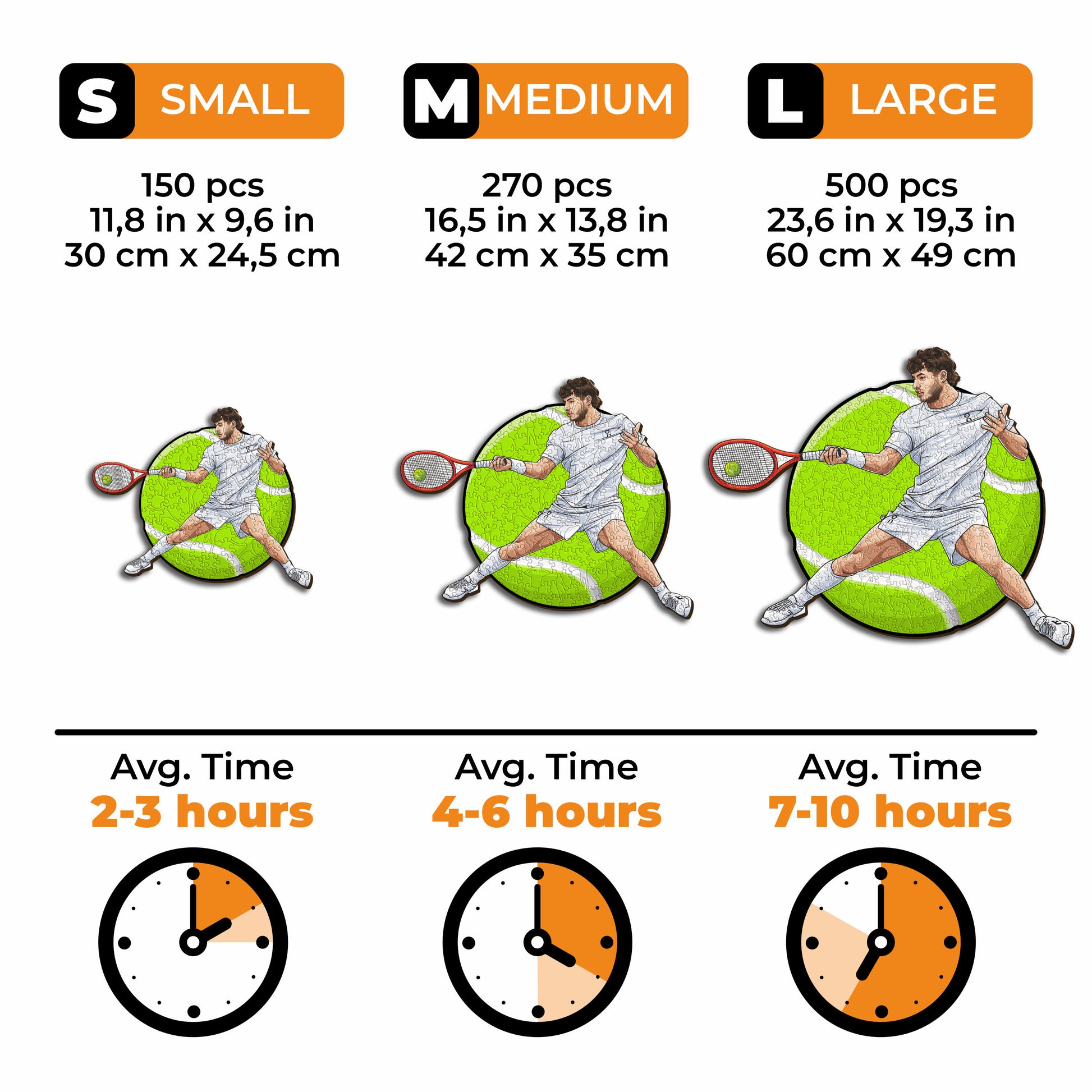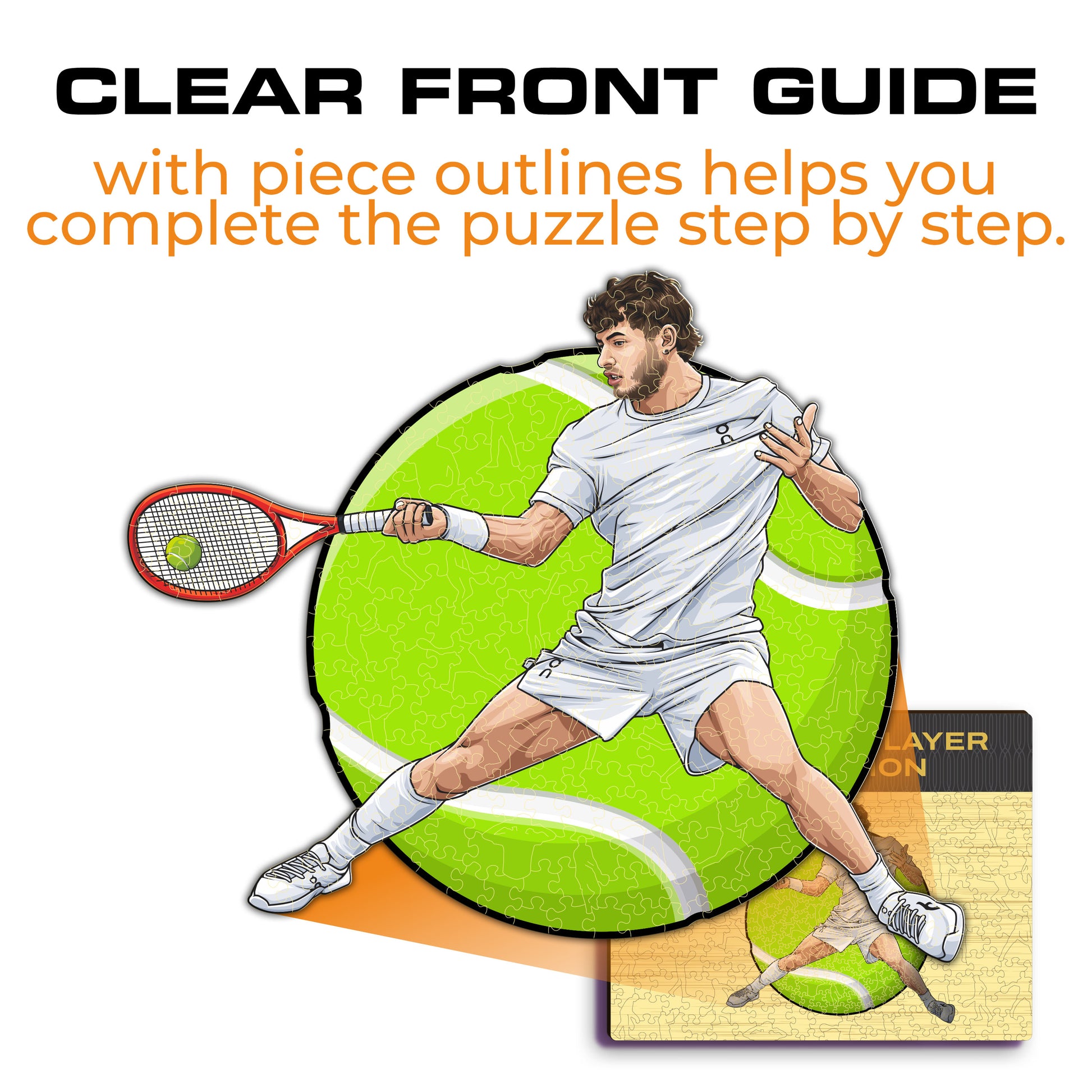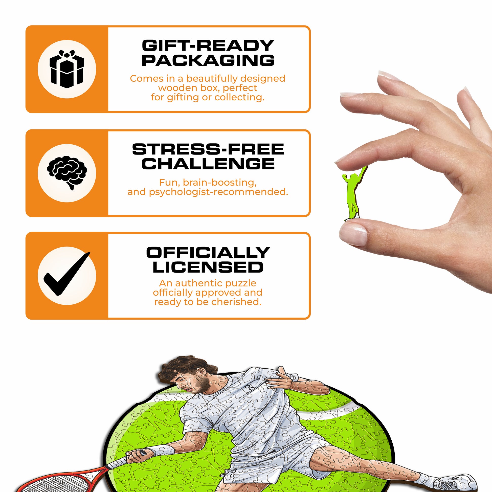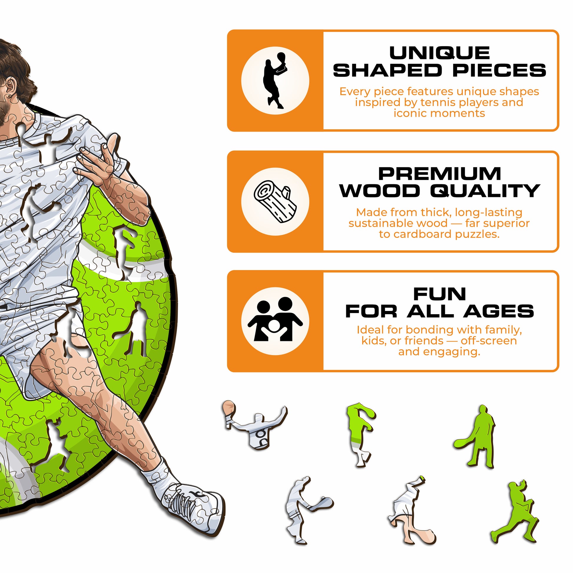 ✓ Each puzzle piece has a unique shape that depicts elements related to tennis and iconic player poses.