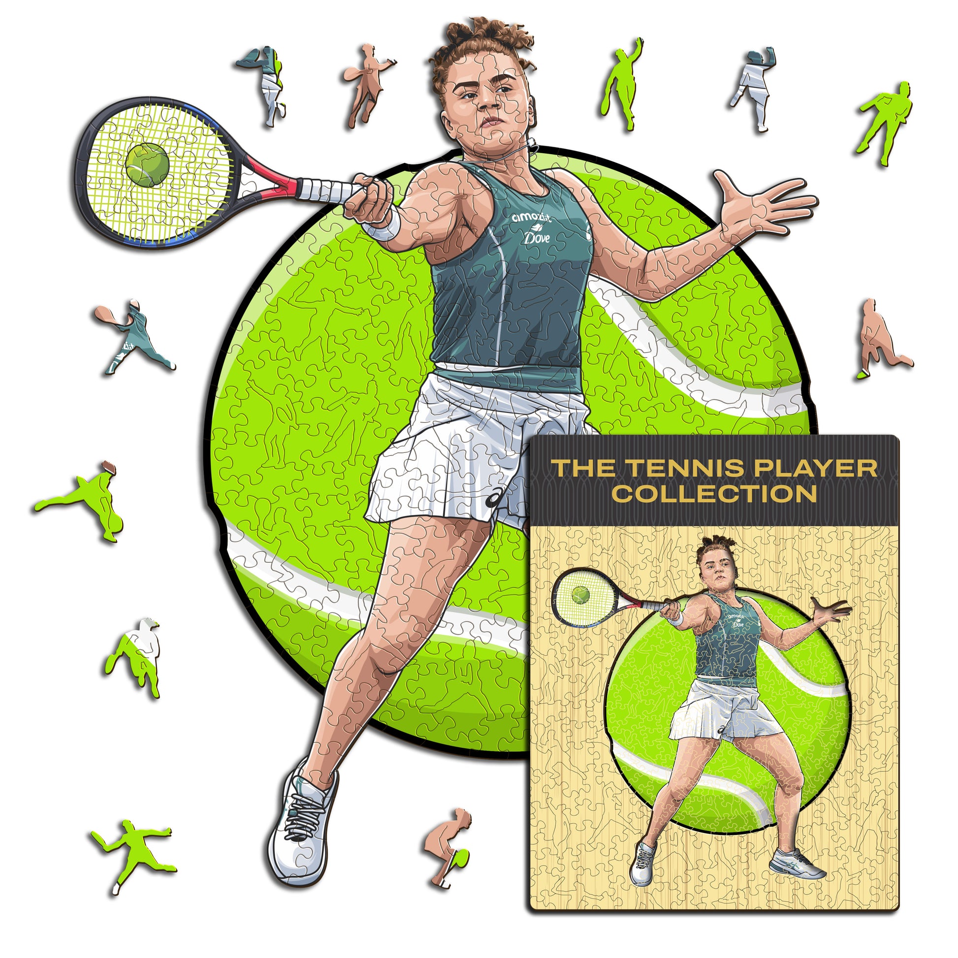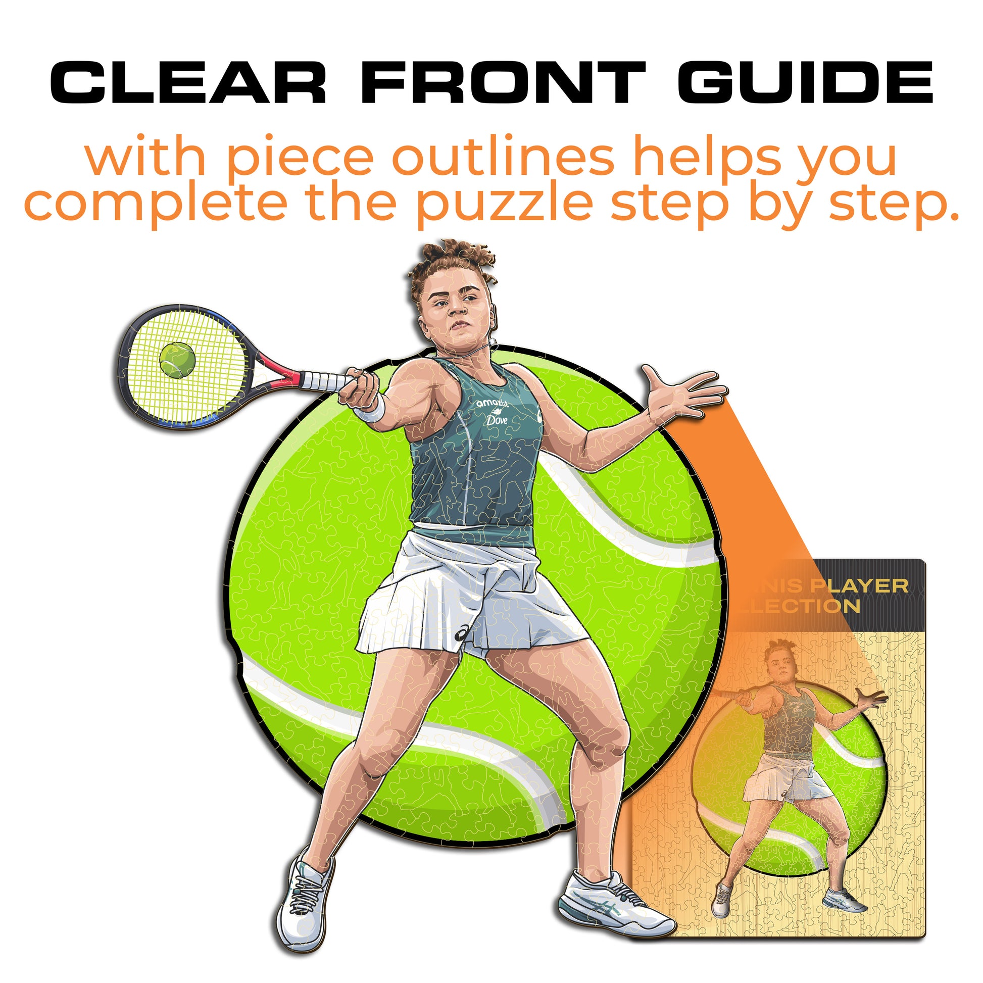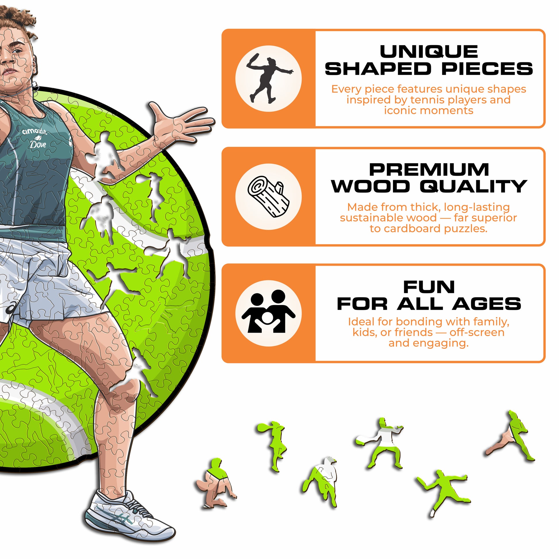 ✓ Each puzzle piece has a unique shape that depicts elements related to tennis and iconic player poses.