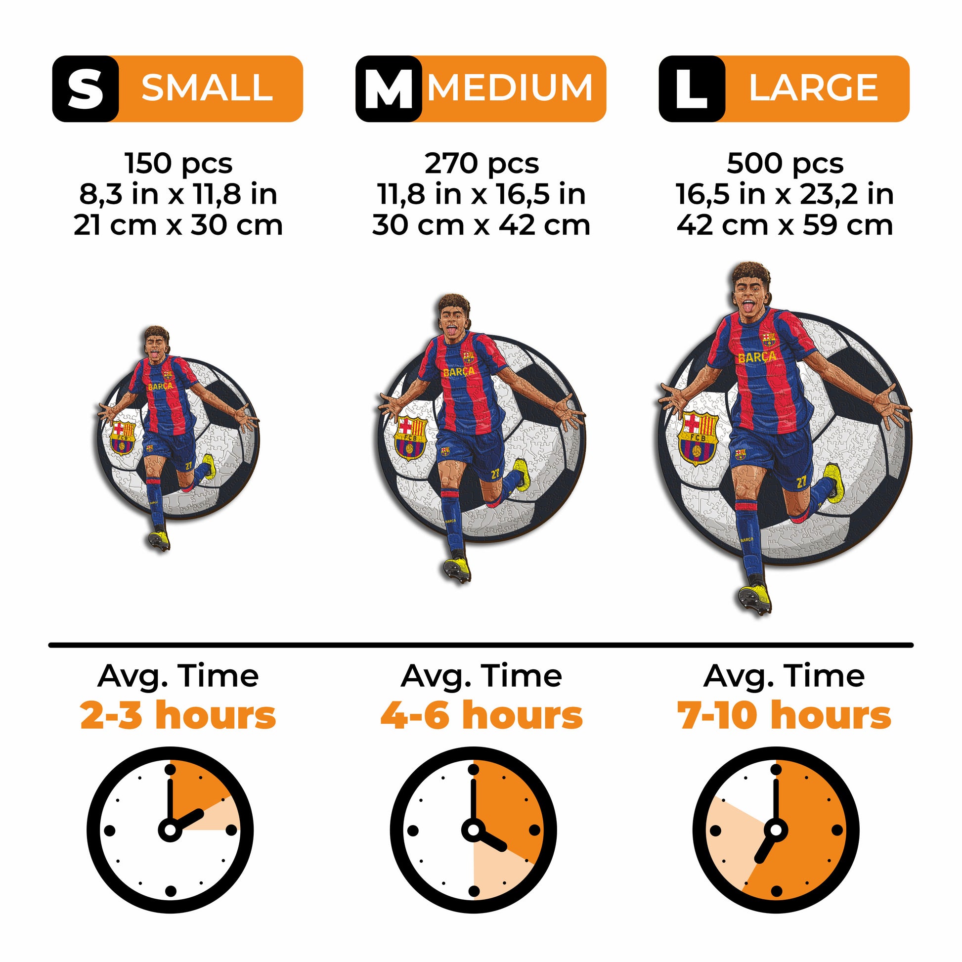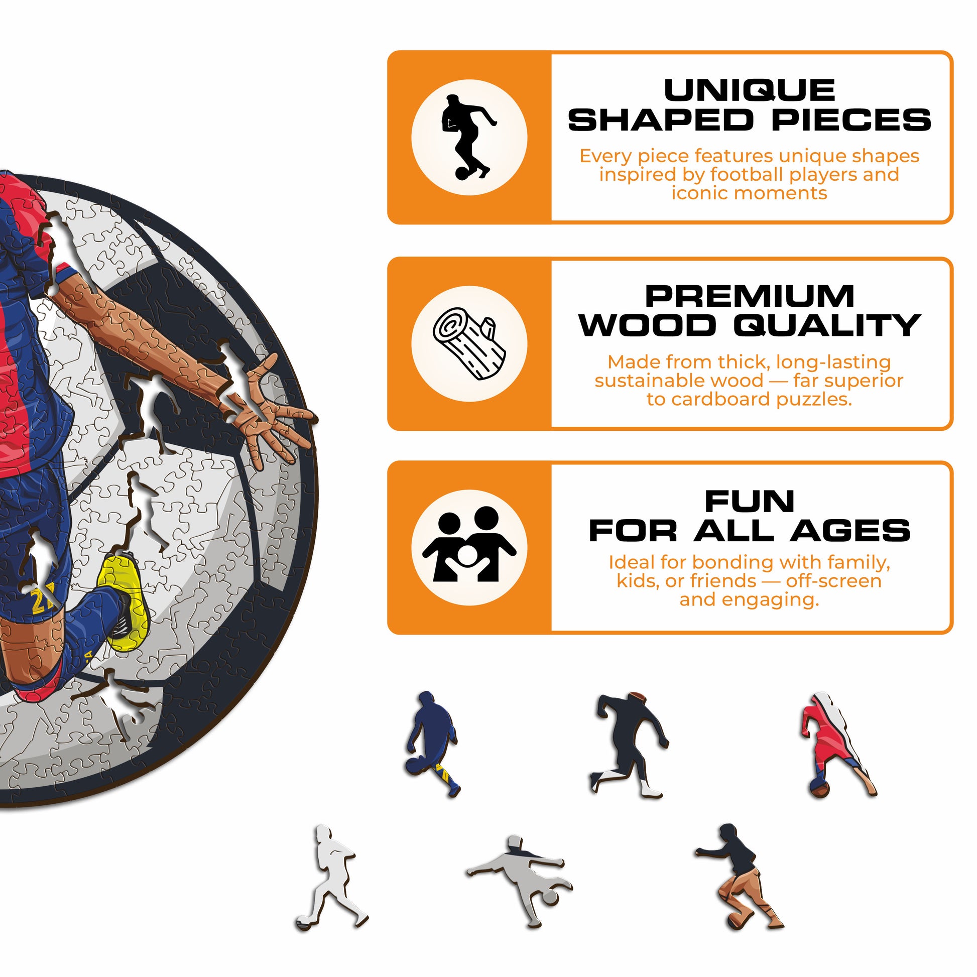 ✓ Each puzzle piece has a unique shape that depicts elements related to soccer and iconic player poses.