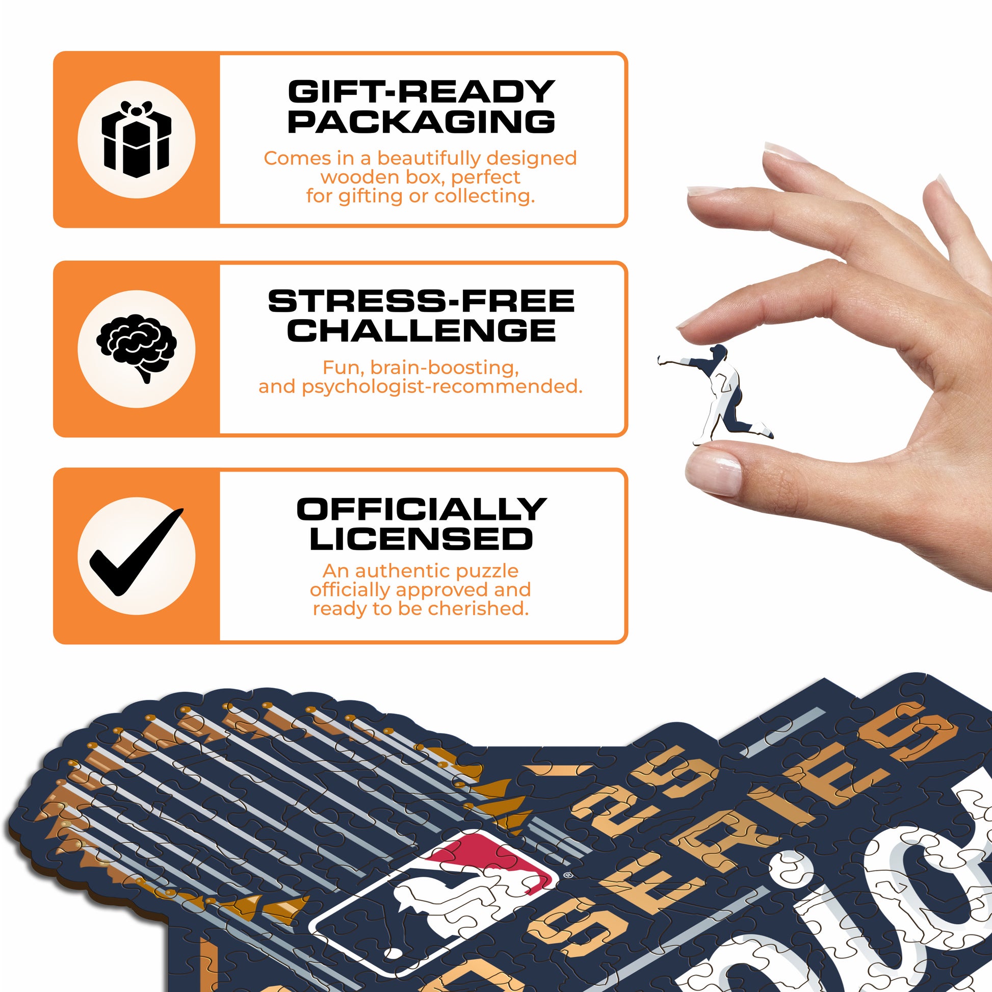 ✓ Each puzzle piece has a unique shape that depicts elements related to baseball and iconic player poses.