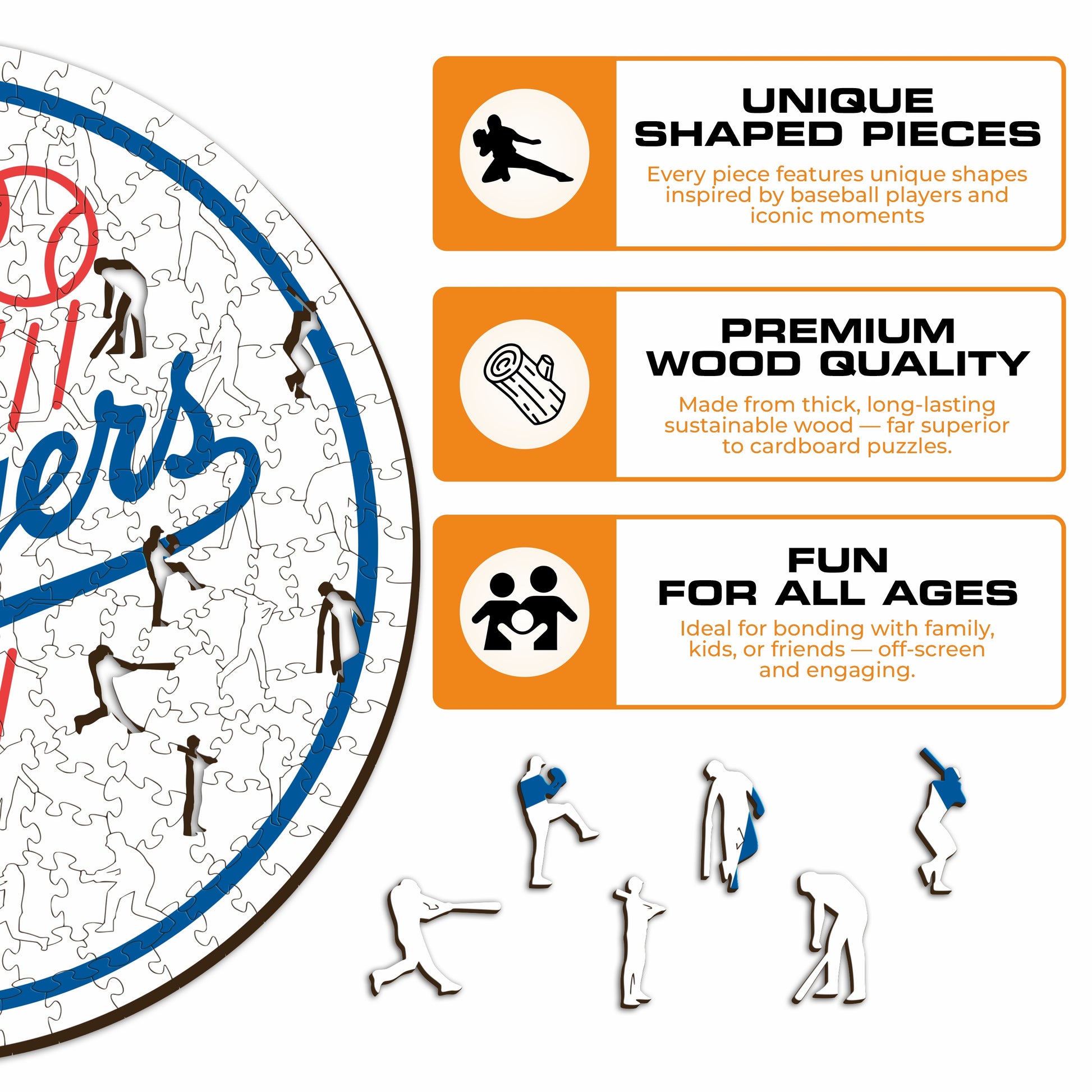 ✓ Each puzzle piece has a unique shape that depicts elements related to baseball and iconic player poses.
