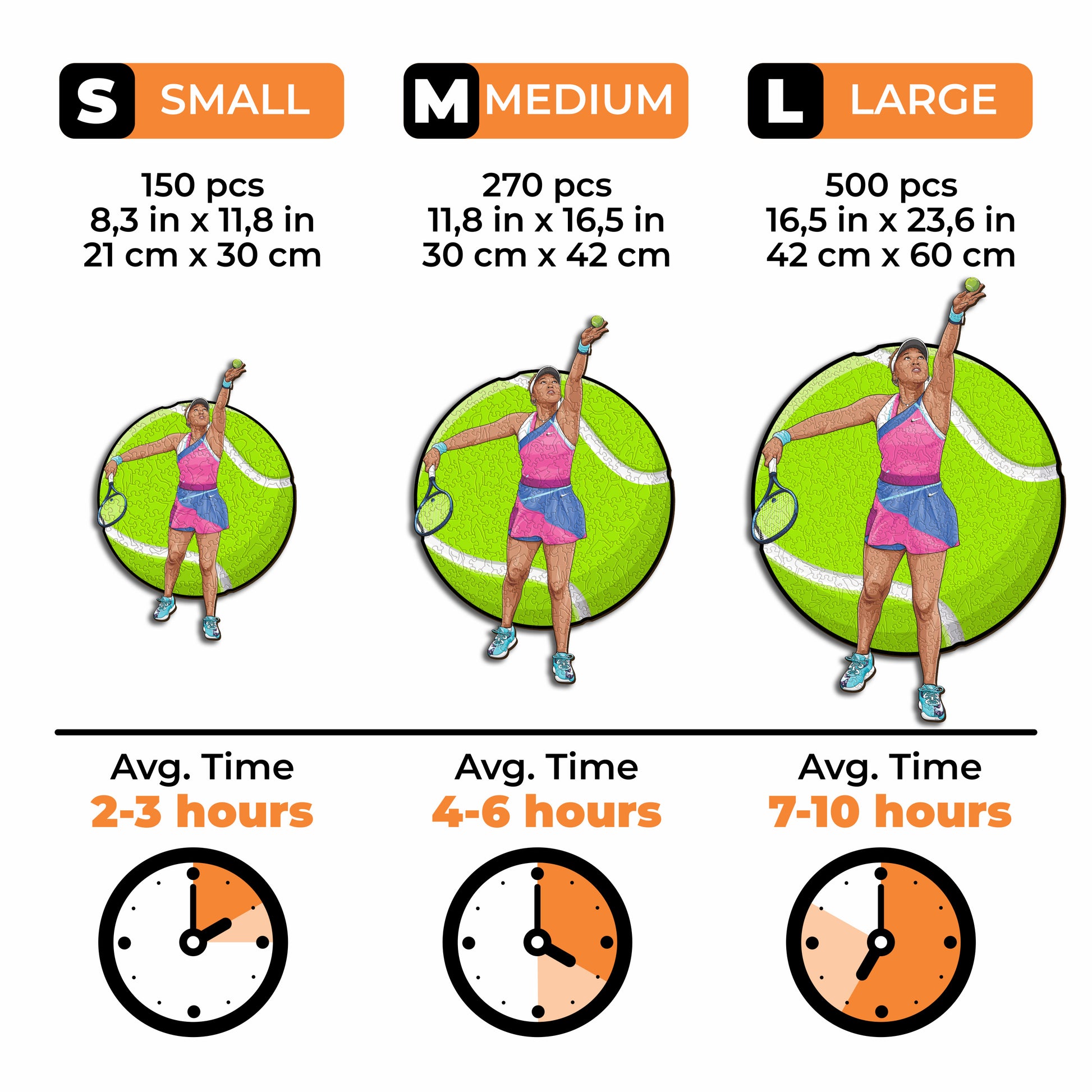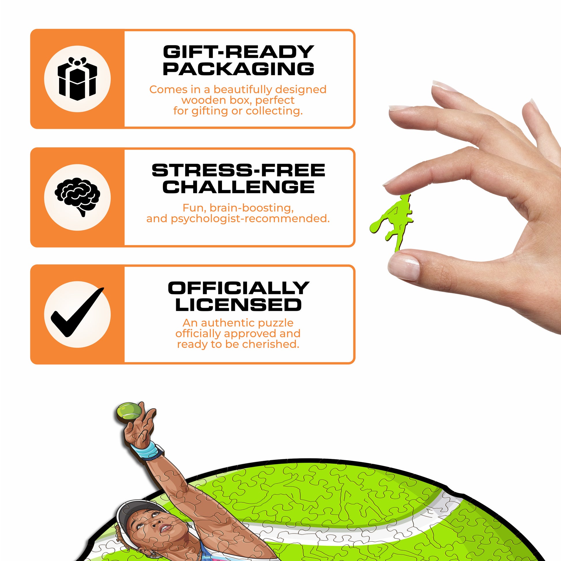 ✓ Each puzzle piece has a unique shape that depicts elements related to tennis and iconic player poses.