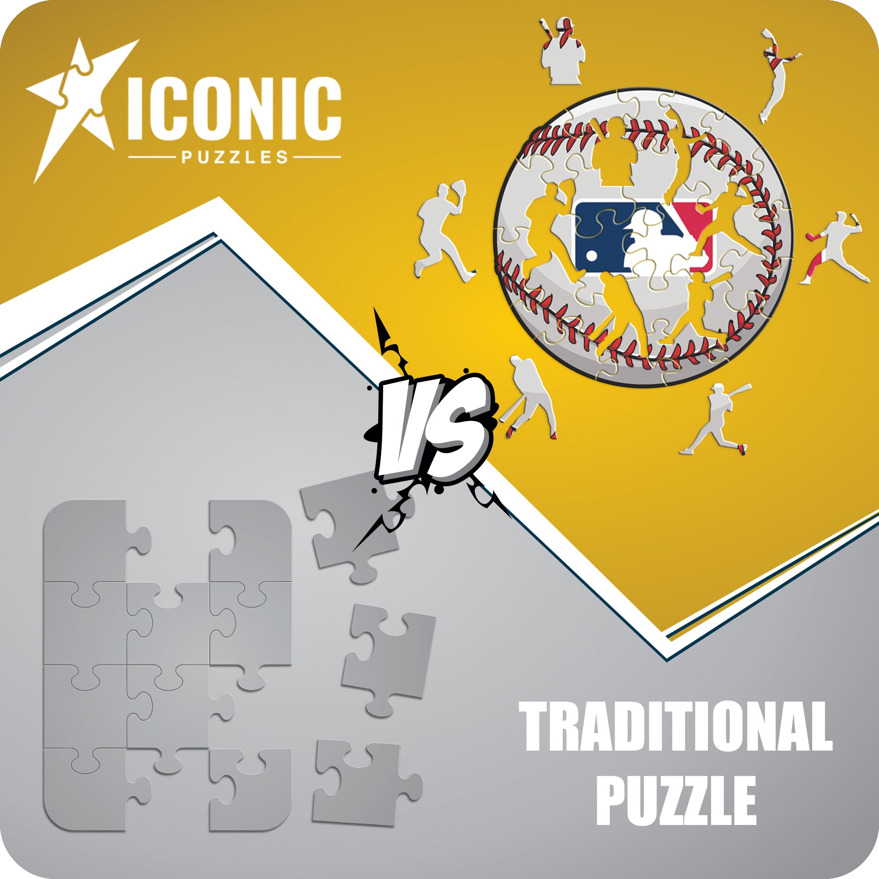✓ Each puzzle piece has a unique shape that depicts elements related to baseball and iconic players' poses.