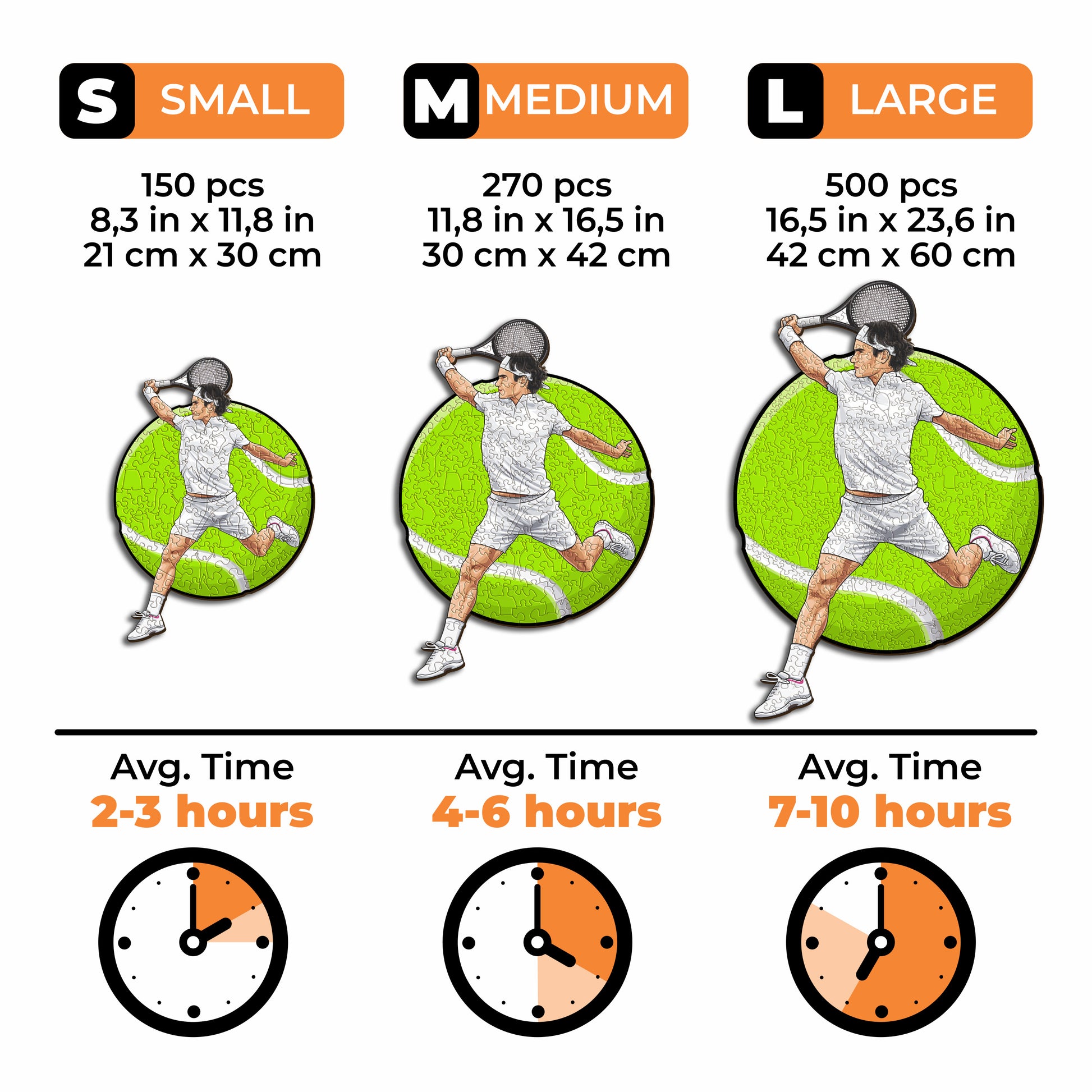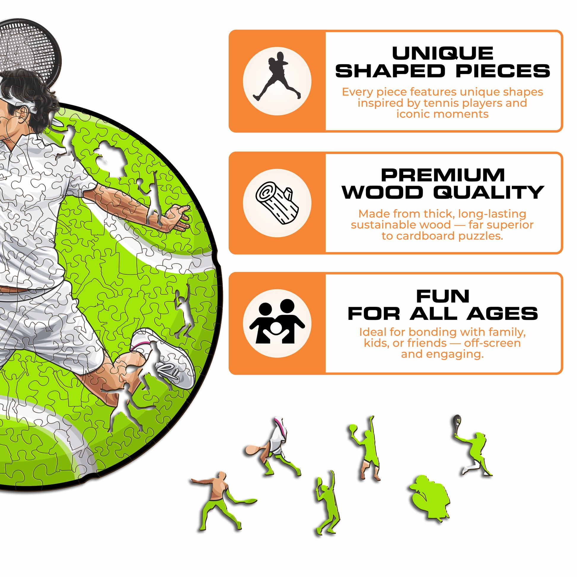 ✓ Cada peça do puzzle tem um formato único que retrata elementos relacionados com o ténis e poses icónicas dos jogadores.