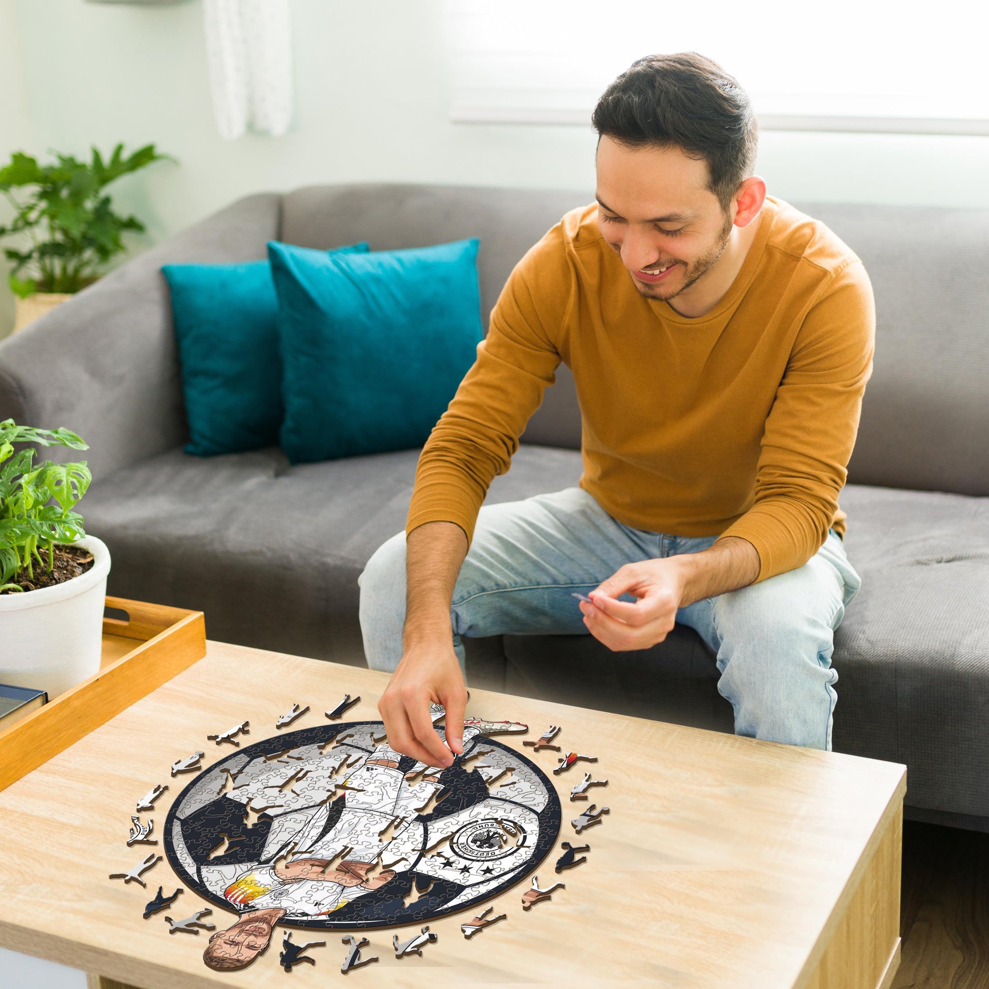 ✓ Cada peça do quebra-cabeça tem um formato único que retrata elementos relacionados ao futebol e poses icônicas de jogadores.