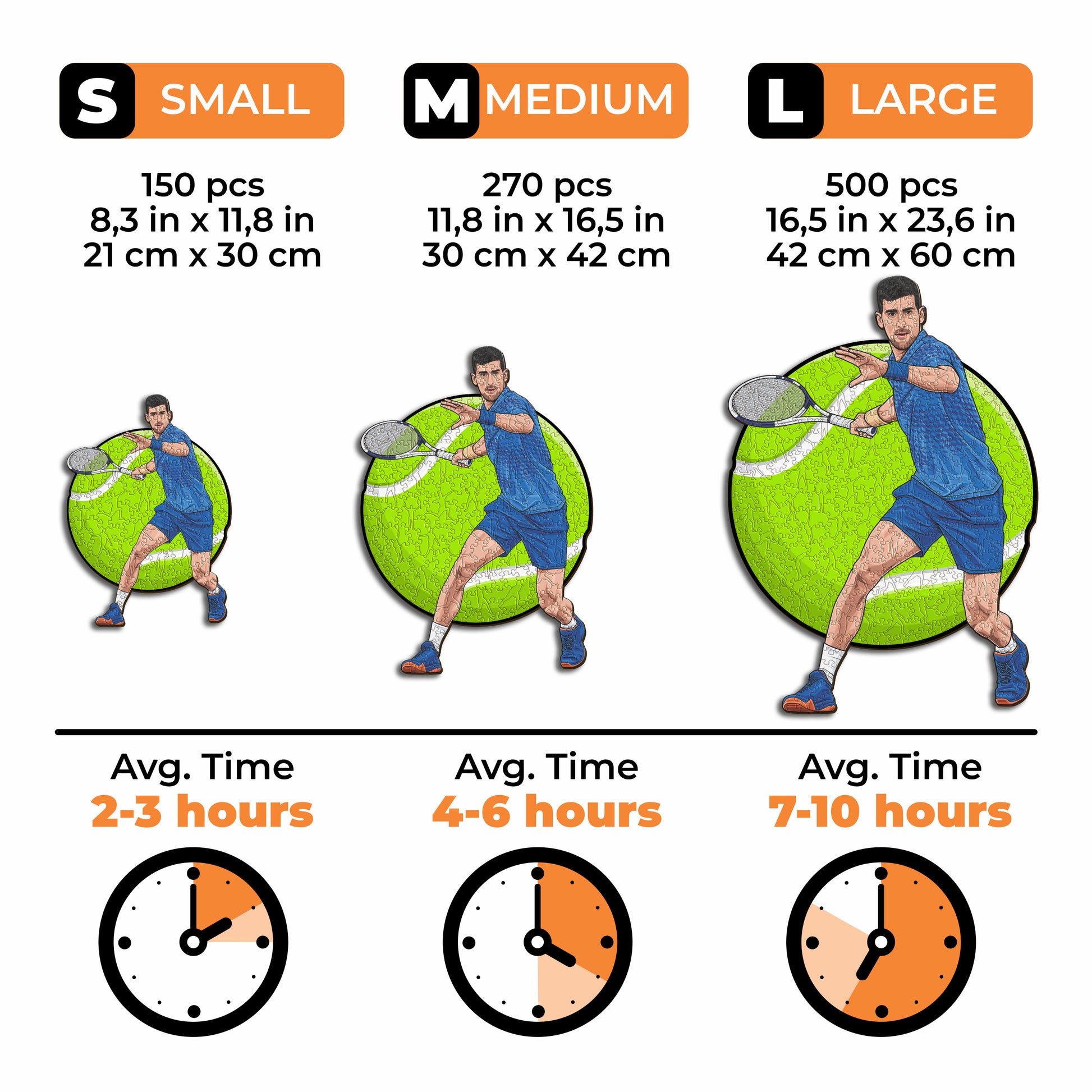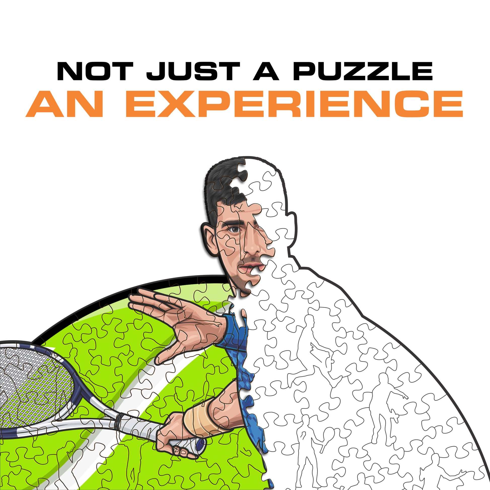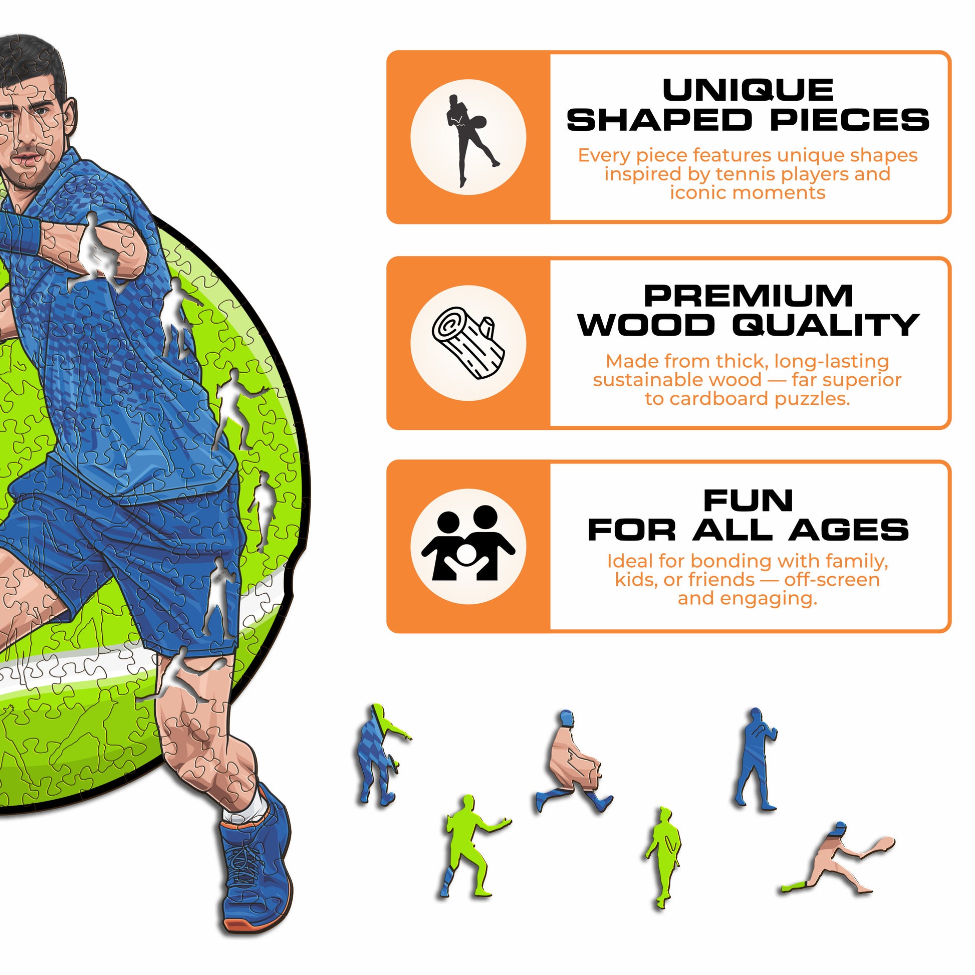 ✓ Cada peça do puzzle tem um formato único que retrata elementos relacionados com o ténis e poses icónicas dos jogadores.